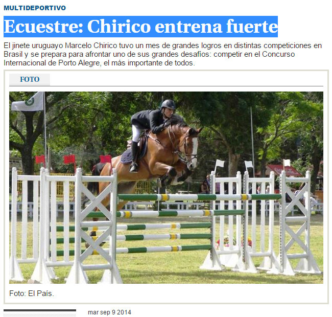 Publicación de la entrada:09/09/2014Ecuestre: Chirico entrena fuerteOvación, El País, 9 de setiembre de 2014 Leer más artículos Entrada anteriorMarcelo Chirico (URU) é o campeão do GP Internacional Clube Hipico Santo Amaro Siguiente entradaPremio Charrúa 2013 / 2014 en Deportes EcuestresTambién podría gustarteSobre el Marco de Oro 201002/10/2010Equitación: El riverense Marcelo Chirico finalizó en el puesto 81 en los Juegos Ecuestres Mundiales20/09/2018Carmen García-Torres y Pedro Mateos protagonizan la jornada en el CSN4* Copa Suzuki07/05/2022Un uruguayo de chapa mundial19/02/2015Otro riverense de chapa mundial: Marcelo Chirico se clasificó a la Copa26/02/2015Marcelo Chirico descansa en Rivera31/12/2013